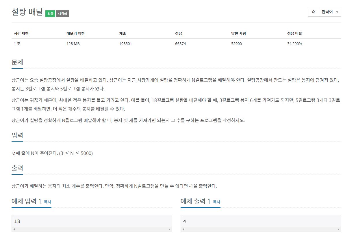 그리디 문제이다. 이 문제의 핵심은 '5킬로그램짜리 봉지를 최대한 많이 사용하는 것'이다. 설탕을 3kg와 5kg짜리 봉지로 나누는 방법: 2 가지 경우 1) 설탕 무게(N)가 5kg으로 나누어 떨어지는 경우 이때는 5kg짜리 봉지만 사용하면 되므로, N을 5로 나눈 몫을 구하면 된다. 예) 25를 나눌 때: 25 / 5 = 5 2) 설탕 무게(N)가 5kg으로 나누어 떨어지지 않는 경우 이때는 N이 5로 나누어 떨어질 때까지, N에서 3을 빼준다. 만약 반복적으로 3을 빼다가, 5의 배수가 나오면 5로 나눠준다. 예)21킬로그램의 설탕을 나눌 때: 21-3-3=15, 15 / 5 = 3 만약 반복적으로 3을 빼다가, 음수가 나오면 3과 5로 만들 수 없는 수이므로 -1을 출력한다. 예)22킬로그램의 설..
